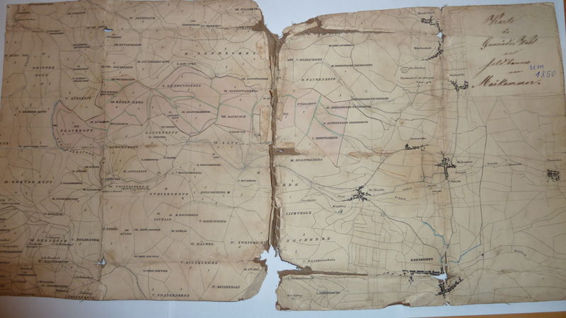 Die Karte Feld- und Waldbann Maikammer (1850) entstand um das 1850 und zeigt die Waldparzellen zu Alsterweiler an.