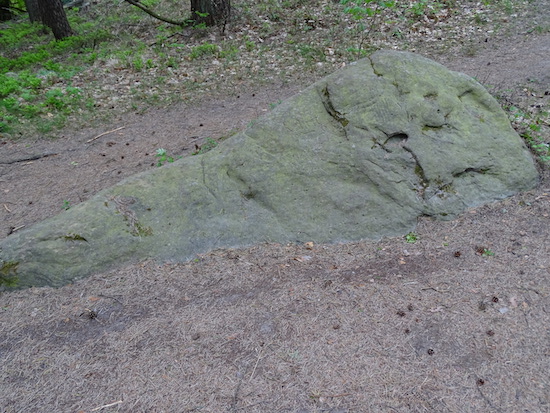 Der Wegweiserstein steht unterhalb des Taubenkopfes an der Weggabelung zur Kalmit.