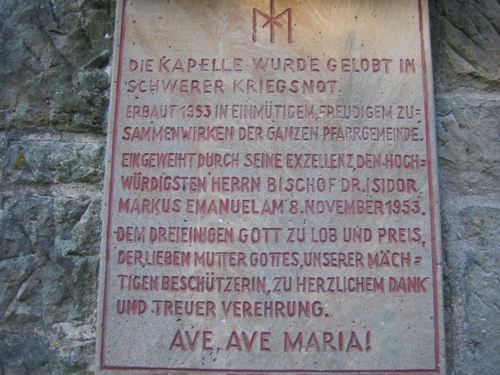 | Beschreibung | Ansicht der Erinnerungstafel an der Südseite der Kapelle (Schutzkapelle an der Kalmitstraße). |