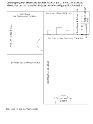 Die Zeichnung ist übertragen von der Originalurkunde, die im Landesarchiv Speyer unter der Bezeichnung LA Sp D 2 Nr.734 Blatt250 liegt. Es handelt sich um das Alsterweiler Hofgut des Allerheiligenstifts Speyer, wohl im frühen 18. Jahrhundert. Die Längenangaben sind in Schuo, wohl Schuh.