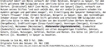 StA Wü MIB 9 fol.260v ist eine Urkunde, die im Staatsarchiv Würzburg verwahrt wird. Erzbischof Adolf von Mainz, damals auch Bischof von Speyer, verkauft der Speyerer Bürgerin Irmel Naldisen eine jährliche Gült von 50 Gulden von den bischöflichen Dörfern ...Kirrweiler (Kyrwilre), Maikammer (Meinkeimer), Alsterweiler (Agoleisterwilre)... "von allen dazugehörigen Fronhöfen, Zehnten, Gütern, Zinsen, Nutzungen, Gefällen, Rechten und Renten." Die Gülte ist jährlich an Martini, dem 11. November, in Speyer zu bezahlen. Irmel Naldisen hatte dem Hochstift Speyer 500 Guldgulden geliehen. Die Urkunde datiert auf den 24. Mai 1381.